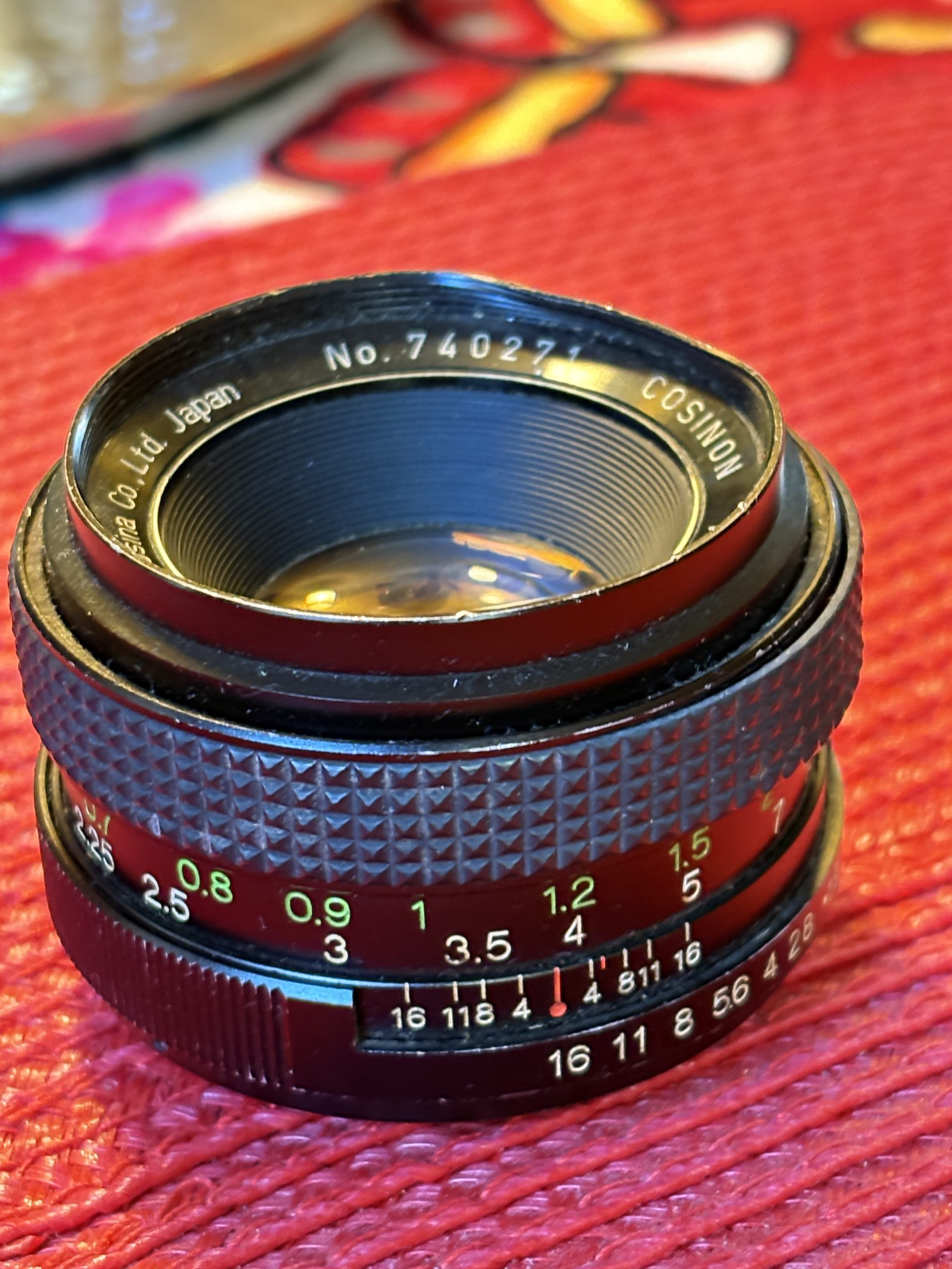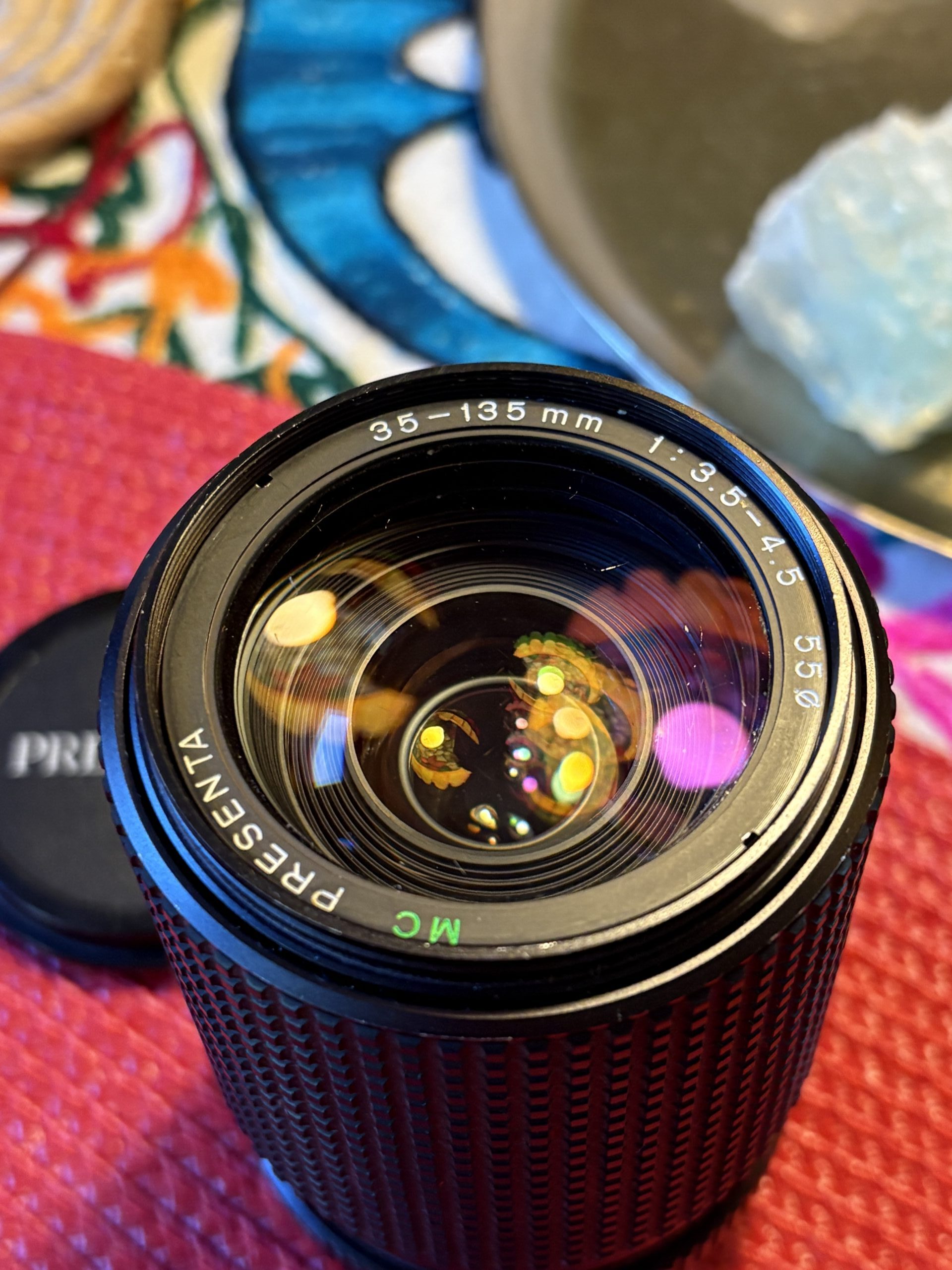 ein Teleobjektiv, Aufschrift: MC Presenta 35-135mm 1:3.5-4.5 55Durchmesser und ein „universelles“ Objektiv, Aufschrift: Cosinon Auto F=1.9 f=50mm