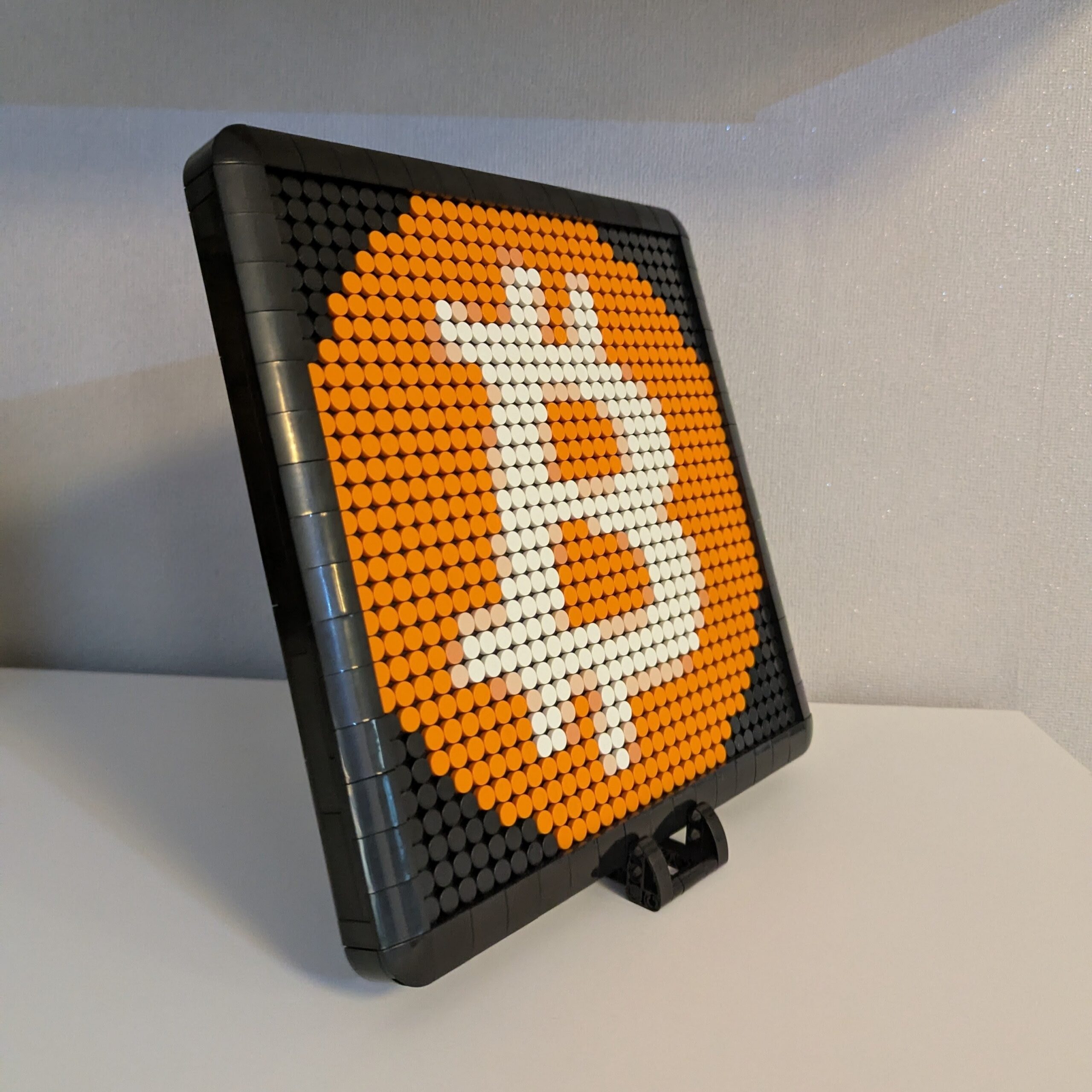 Bitcoin Mosaik 30×30 aus Klemmbausteinen mit Rahmen, Standfuß und Wandhalterung