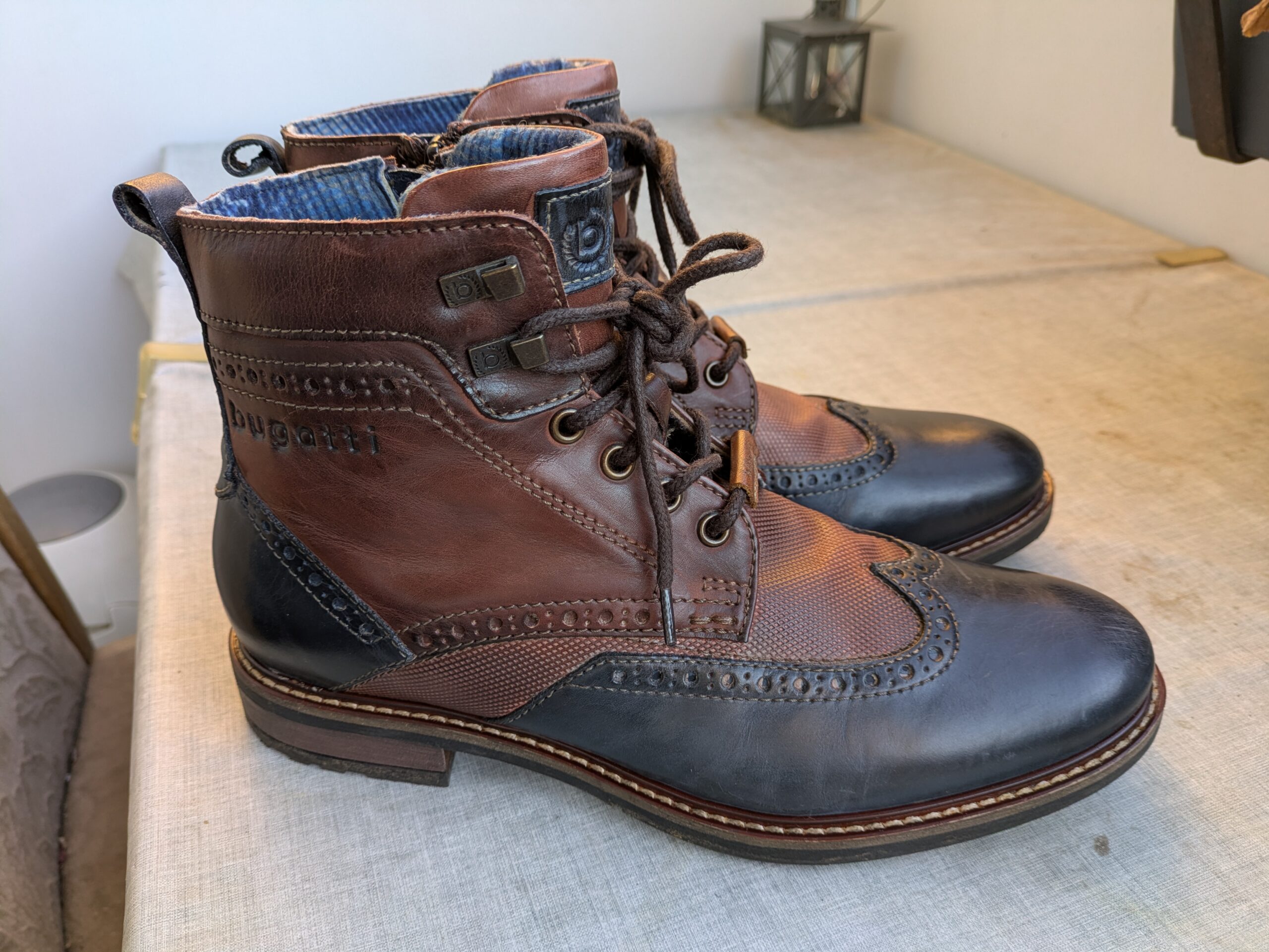 Die Stiefel sind in einer schönen Farbkombination aus braun und dunkelblau gehalten und haben ein klassisches Design mit Schnürung. Das hochwertige Leder und die solide Verarbeitung sind typisch für die Marke Bugatti.