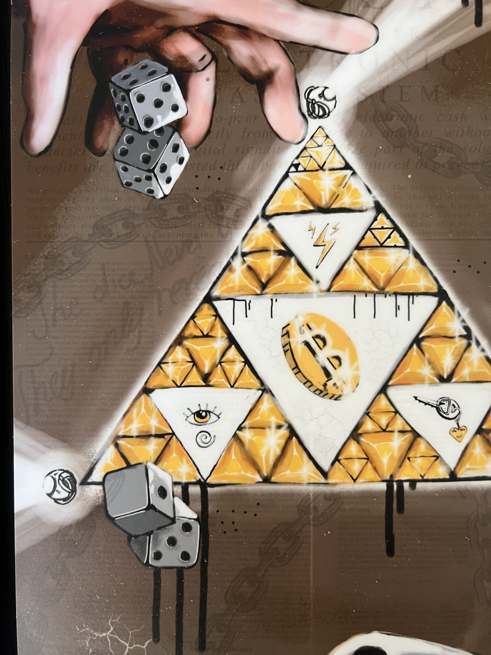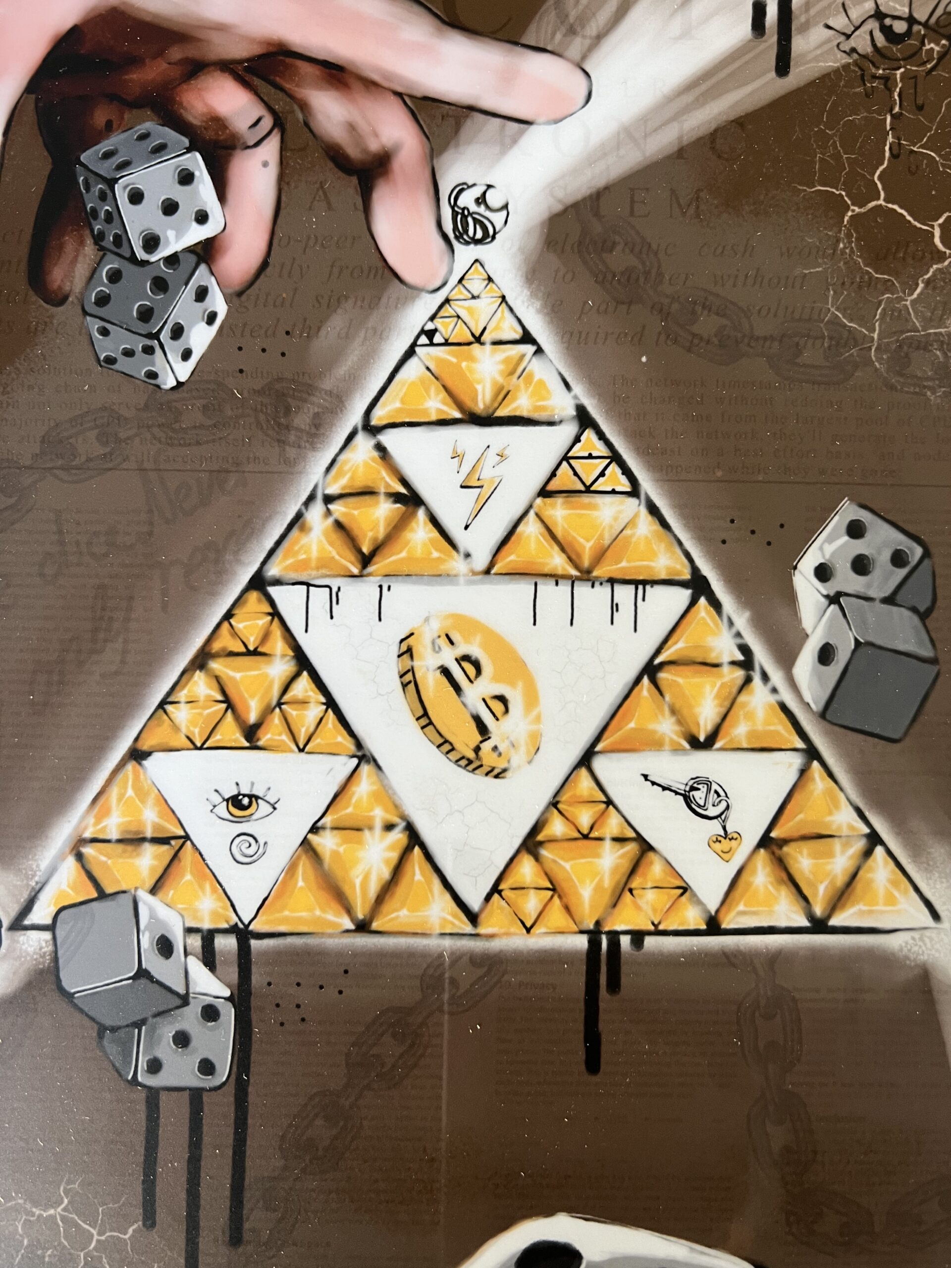 Ich erinnerte mich an das Sierpiński Dreieck. In Kombination mit Geos Lieblingskunstwerken ergab plötzlich alles Sinn, Bitcoin und Würfel. Von außen mag es wie Chaos aussehen. Doch wie beim Dreieck oder in der Natur selbst gibt es immer ein verborgenes System. Ordnung hinter dem Lärm. Und genau so ist Bitcoin. Viele Menschen sehen nur die Oberfläche, die Zufälligkeit, das Chaos. Aber wenn man genauer hinsieht, erkennt man Struktur, Regeln und Wahrheit.