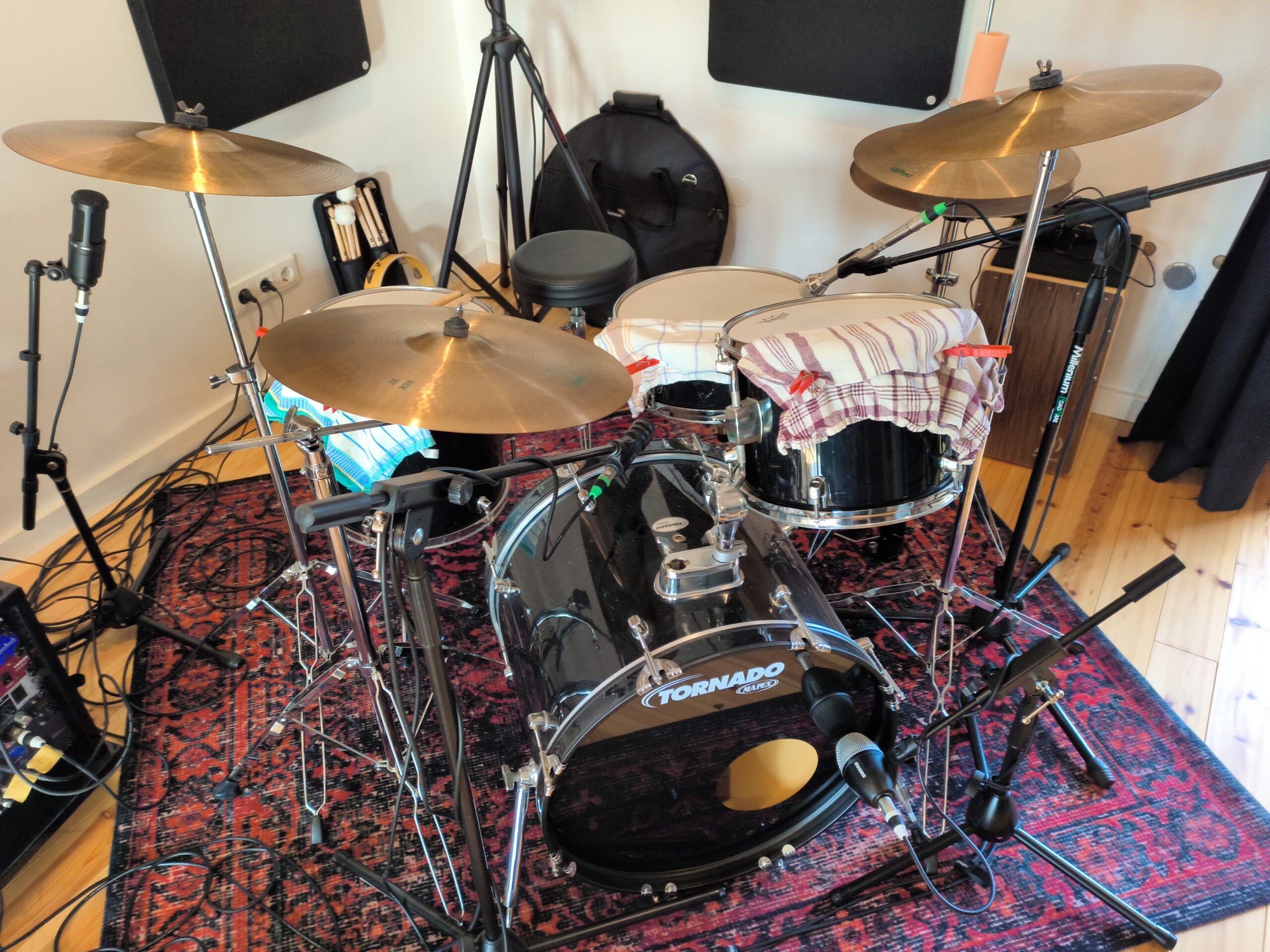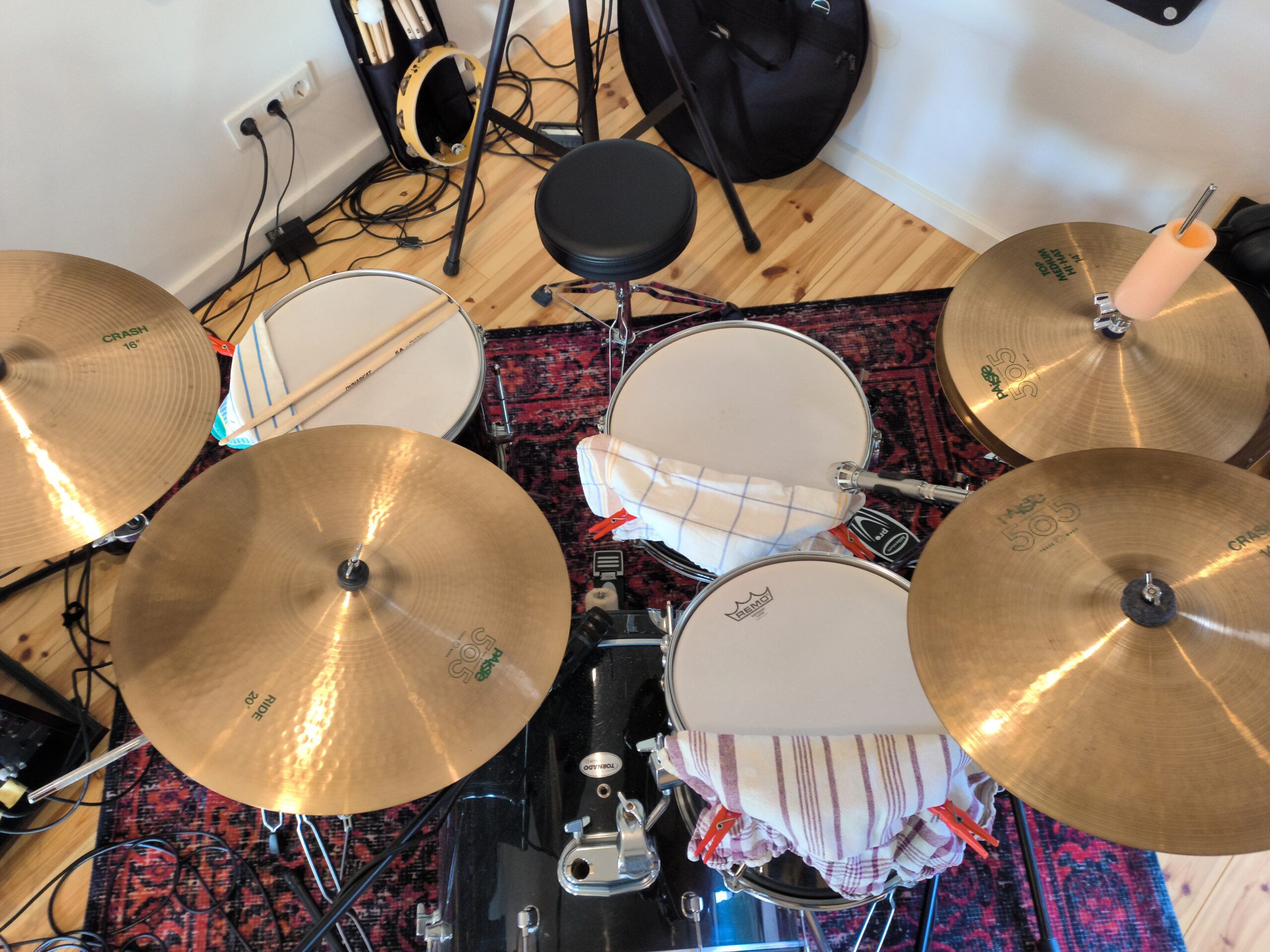 Der Beckensatz (HiHat, Crash, Ride) ist ein No-Name Satz und nicht der auf den Fotos abgebildete von Paiste! Auf den Fotos ist nur eine der beiden Hänge-Toms zu sehen. Die Felle (Remo Emperor Coated) wurden vor ca. 2 Jahren erneuert. Die Mikrofone auf den Fotos gehören natürlich nicht dazu … 😉