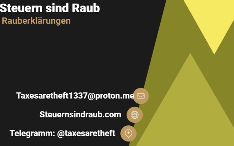 Einfach anschreiben @taxesaretheft (Telegramm) oder per Mail an Taxesaretheft1337@proton.me Steuern sind Raub!